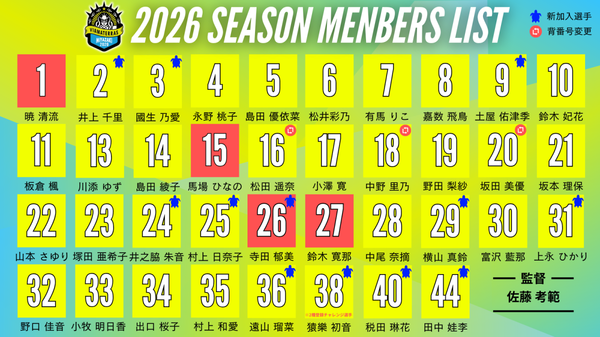 2026シーズンの選手背番号が下記の通り決定しましたので、お知らせいたします。