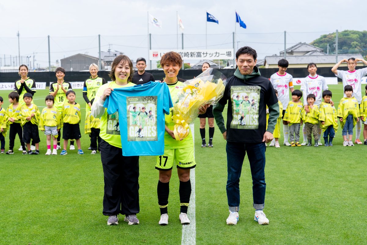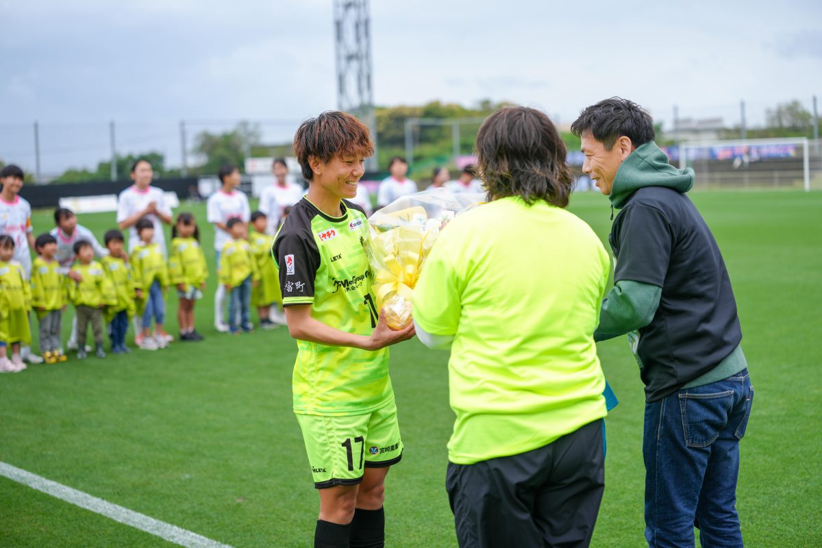 このたび、ヴィアマテラス宮崎に所属する背番号17番 小澤 寛 選手が2026年4月4日にいちご宮崎新富サッカー場で行われた第4節 伊賀FCくノ一三重戦にてなでしこリーグ通算100試合出場を達成しました。